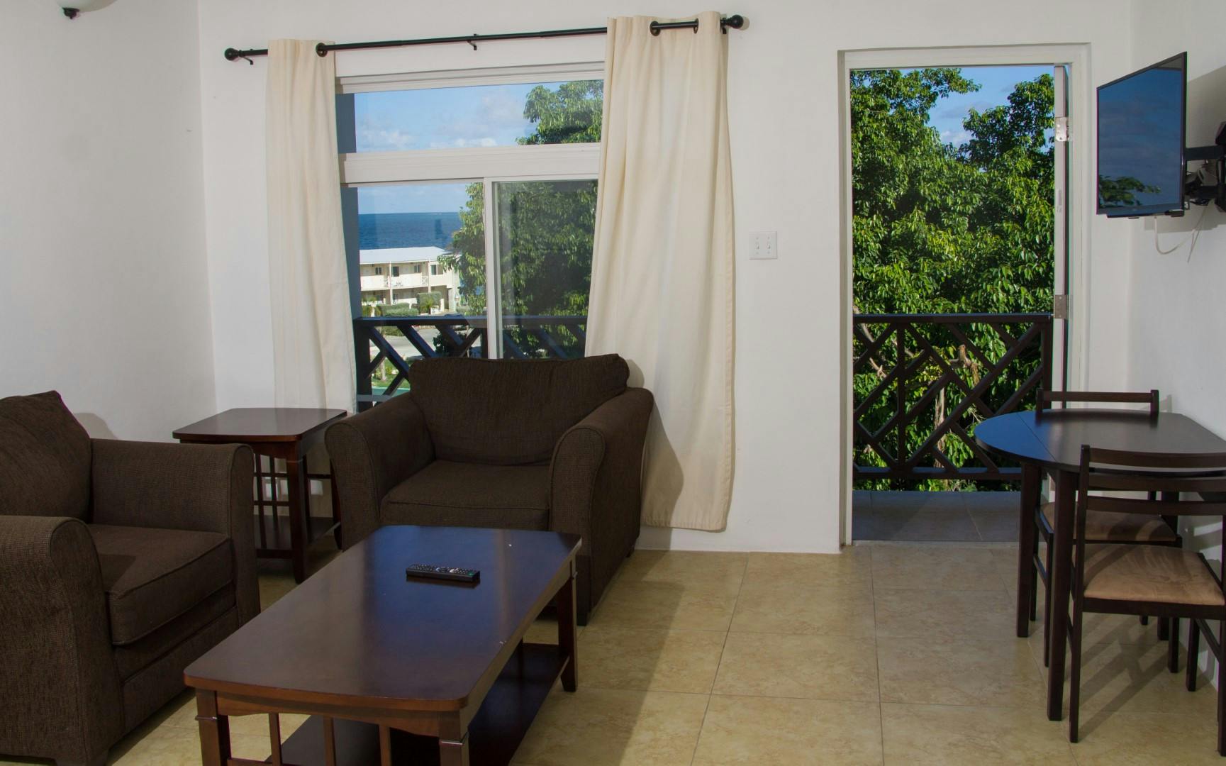 Our spacious one-bedroom apartments are located at the entrance to the property just a short walk to the beachfront and the breaking waves of the Atlantic Ocean. The studio has a living space with a full kitchen, a separate bedroom with a queen bed with en-suite bathrooms. The living room has a sofa with comfortable chairs, cable TV and a fully equipped kitchen with stove, microwave, full-size fridge/freezer, toaster and coffee-making facilities. The kitchen also has all the chinaware, glassware and pots and pans that you would need to prepare a quick snack or your favourite meal.